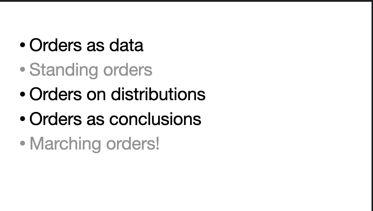 The agenda: what do orders look like as data, what do people say about analysing ordinal data, what gets complicated with orders on distributions and orders as conclusions, and finally, what I want