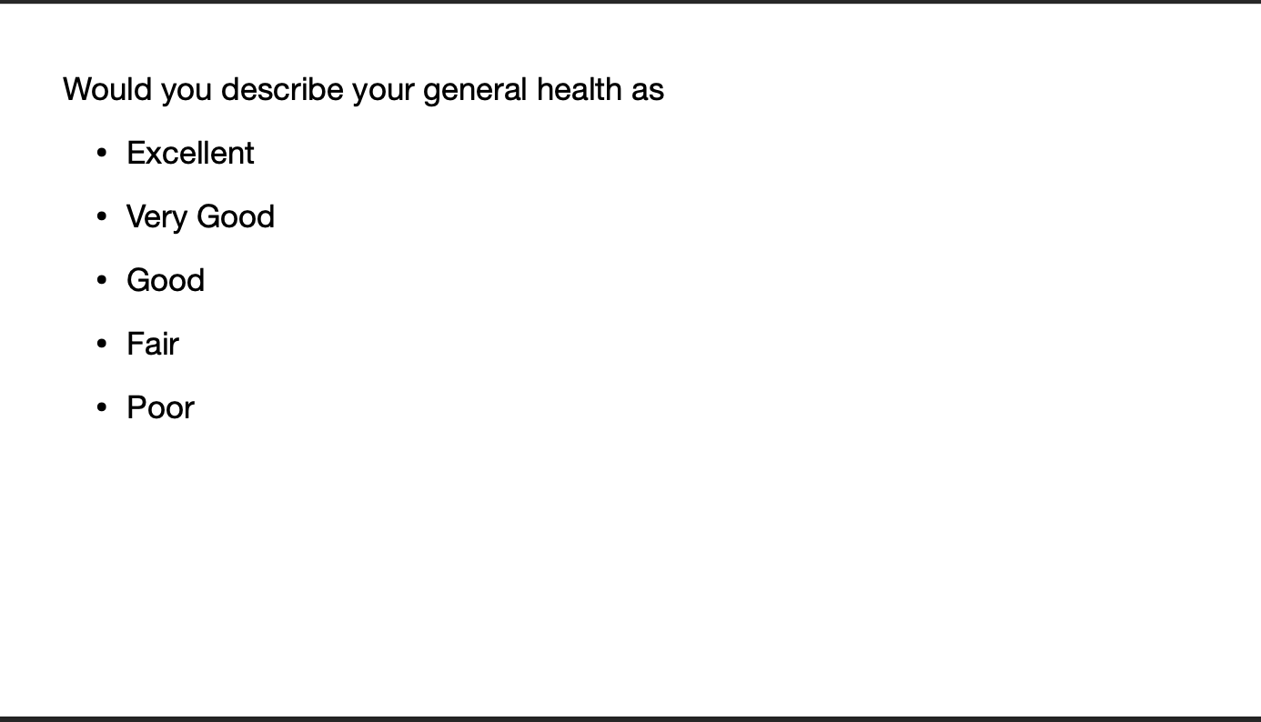 This is a popular self-rated general health question, from the SF-36 questionnaire. People sometimes call it the SF-1. This question, especially in older people, is amazingly good at predicting future health over the next few years. It can be answered over the phone, and presumably over the internet, and is more predictive than most health variables doctors can measure in person.