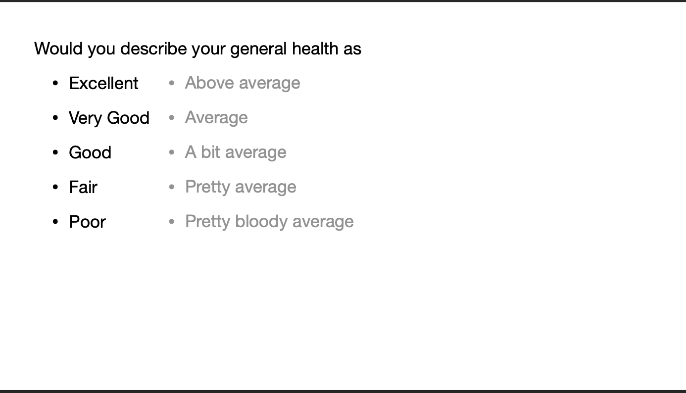 This viewpoint doesn’t fit the SF-1 or the DOOR health scale, and doesn’t really fit restaurant ratings or student evaluations of teaching.