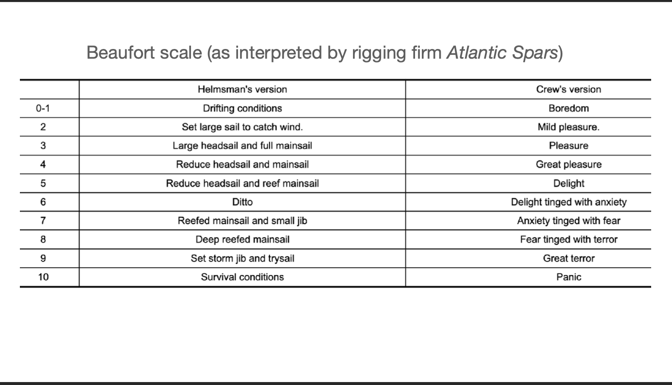 And finally, the Beaufort Scale of wind intensity (as interpreted by a rigging company). The Beaufort scale was initially based on rigging for Royal Navy sailing ships, along the same lines as the categories on the left. It was then modified to use sea conditions (waves, spray), and then modified again for land (trees, leaves).