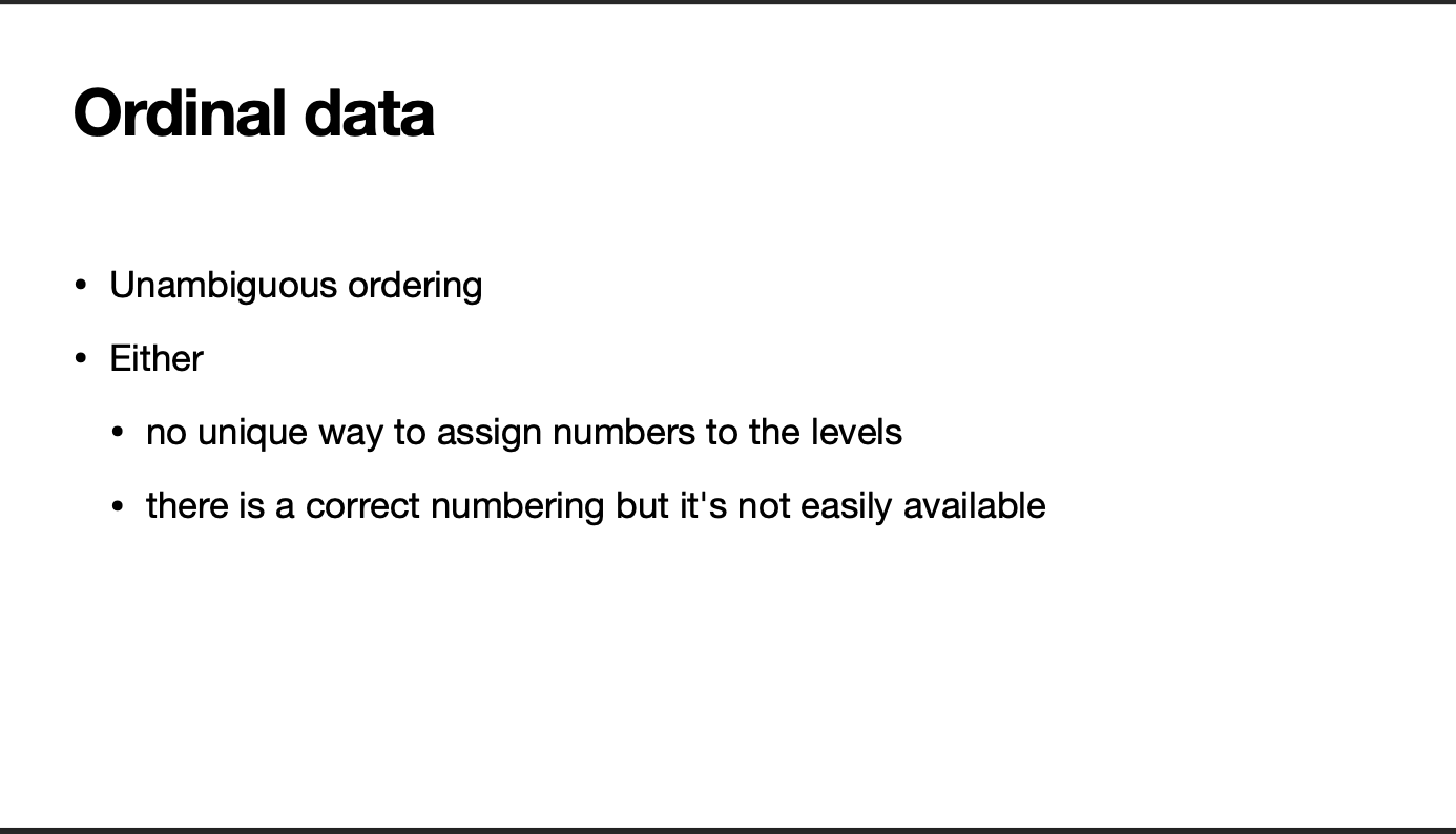 These are all examples of ordinal variables. They have a clear ordering, but they don’t have clear numbering, either because there isn’t a preferred numerical scale underlying them or because there is a preferred numerical scale but we don’t have access to it.