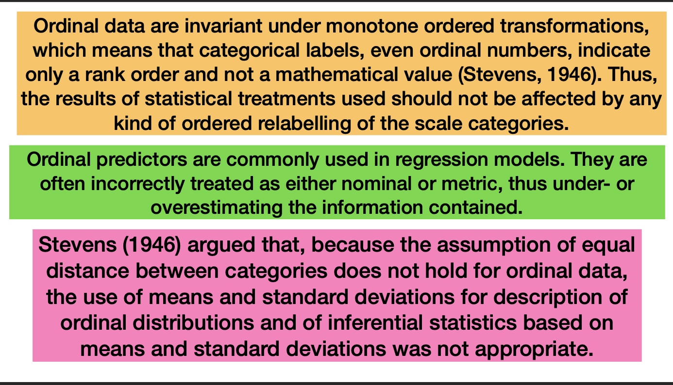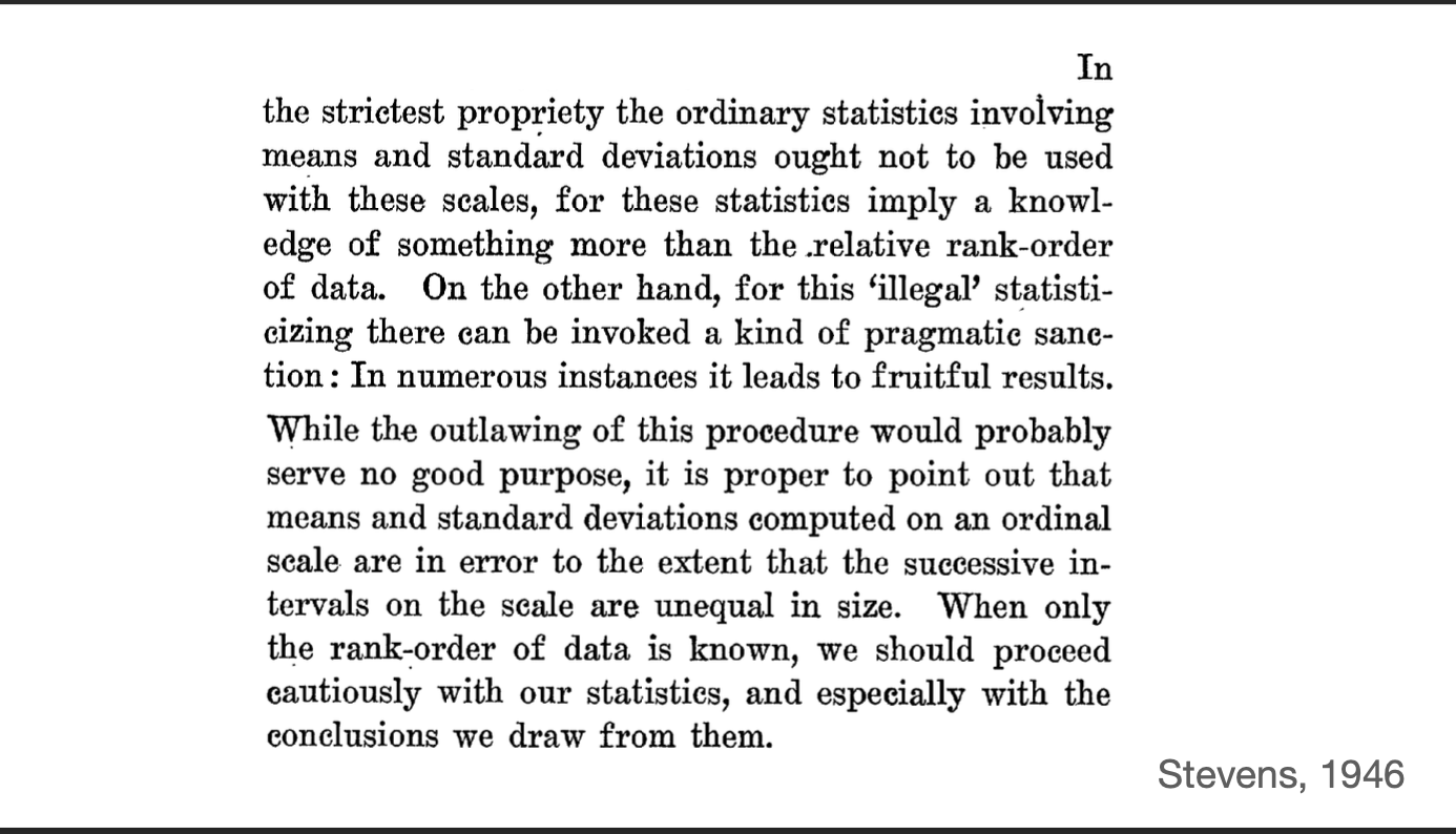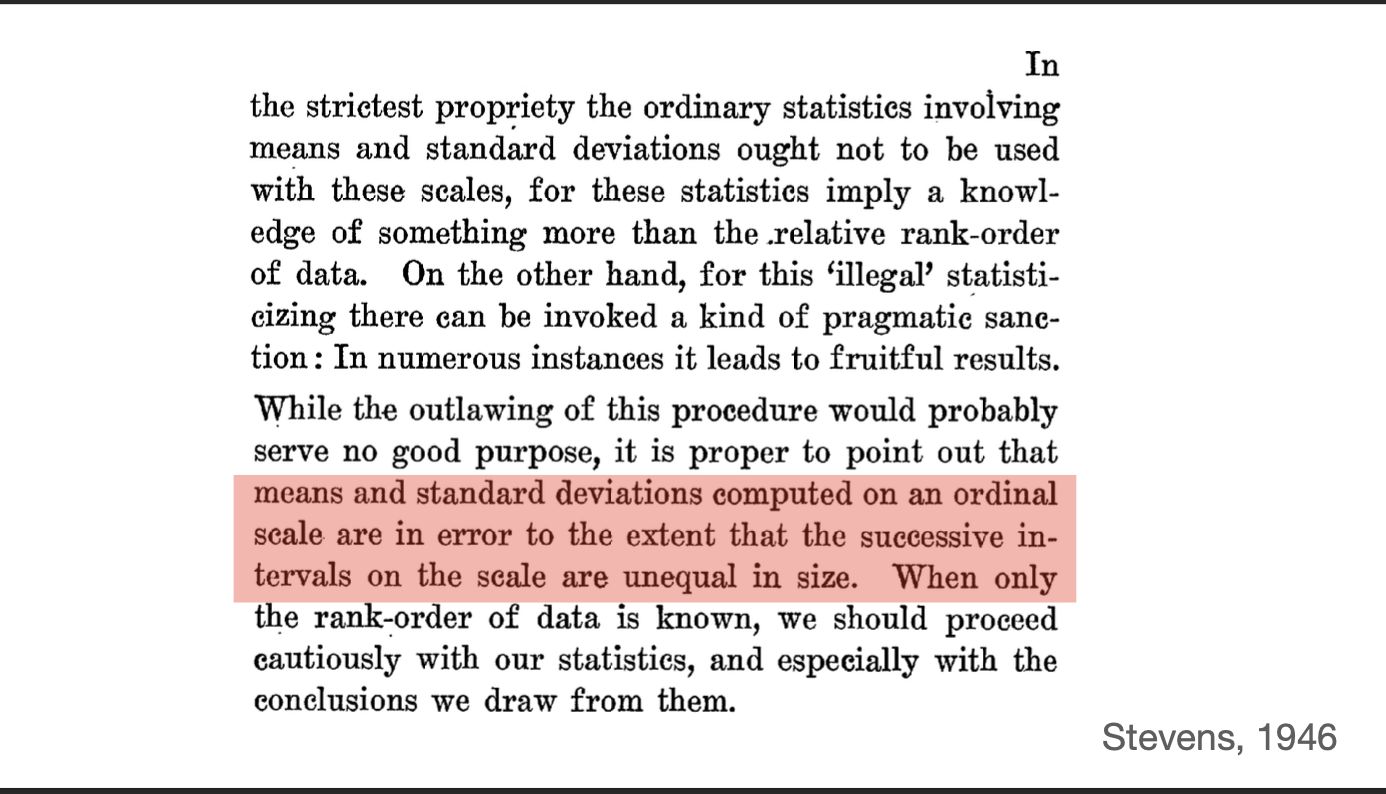 If you actually look at Stevens (1946), he’s less stringent about the protection of ordinal data than many people who invoke him