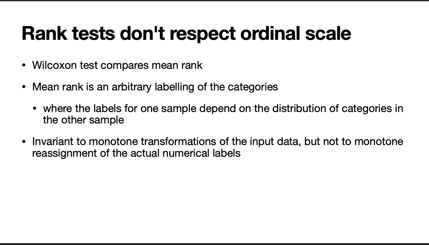 Rank tests would respect ordinal scale if we used ranks just within each sample – but we’d lose all the information.