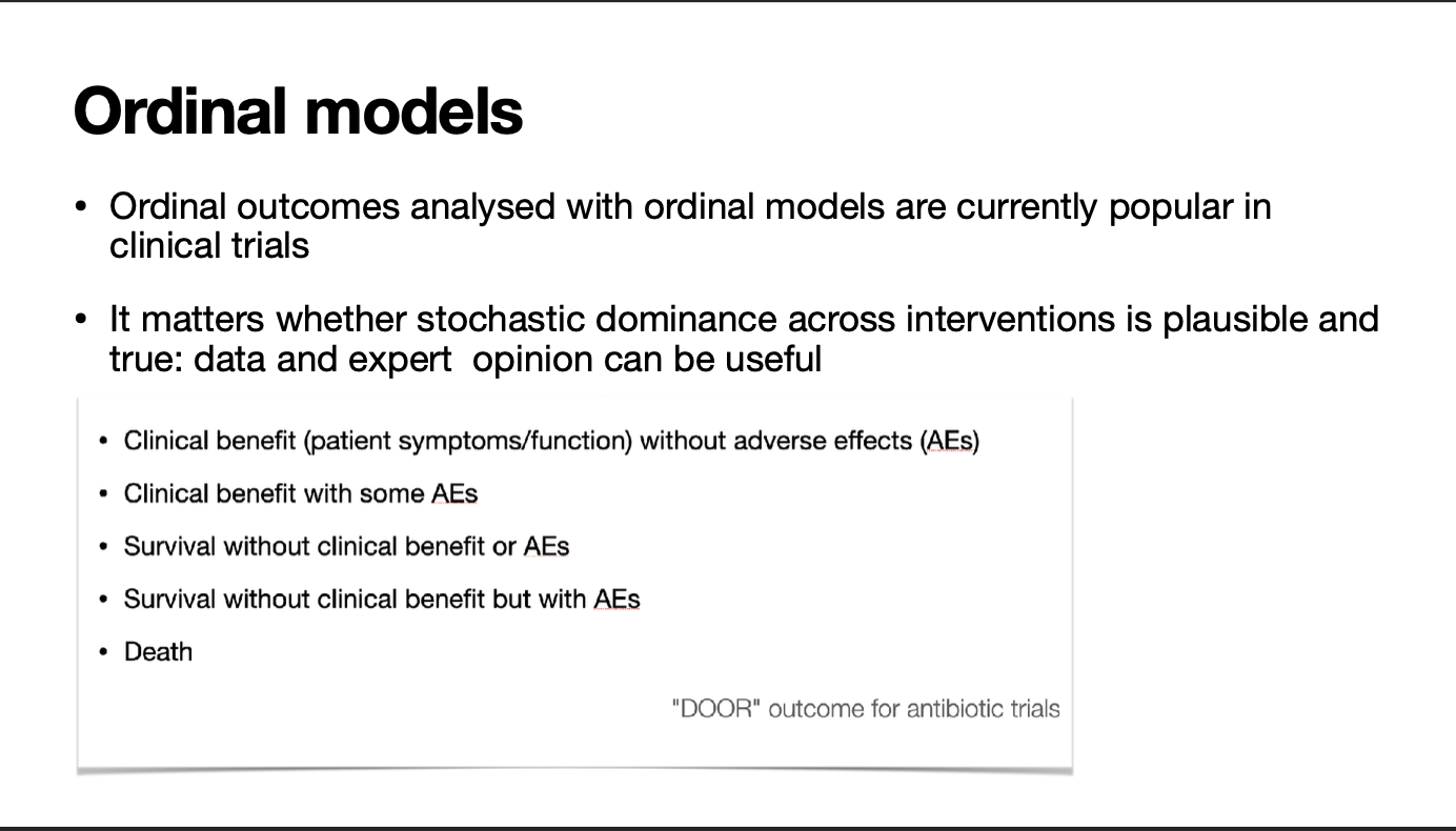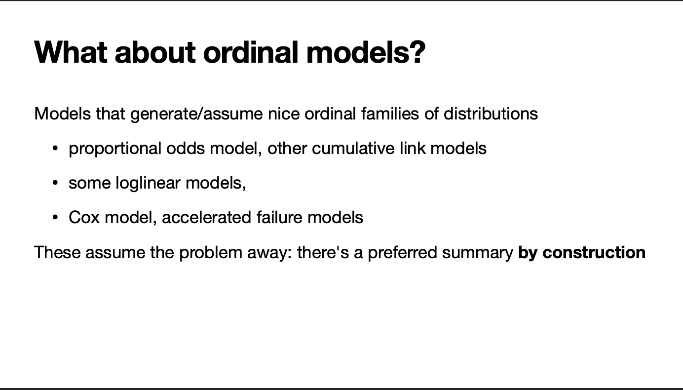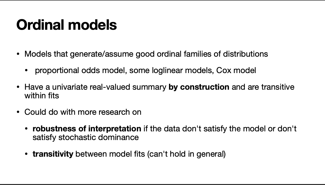 - Someone (?Cameron Patrick) asked about how this differs from Frank Harrell’s views and why. I think (having given a version of this talk at his department and talked to him about this) that Frank regards failures of ordering as less important and less plausible than I do. He has also been more interested in ordinal scales as a way of pushing back against dichotomisation in medical statistics.