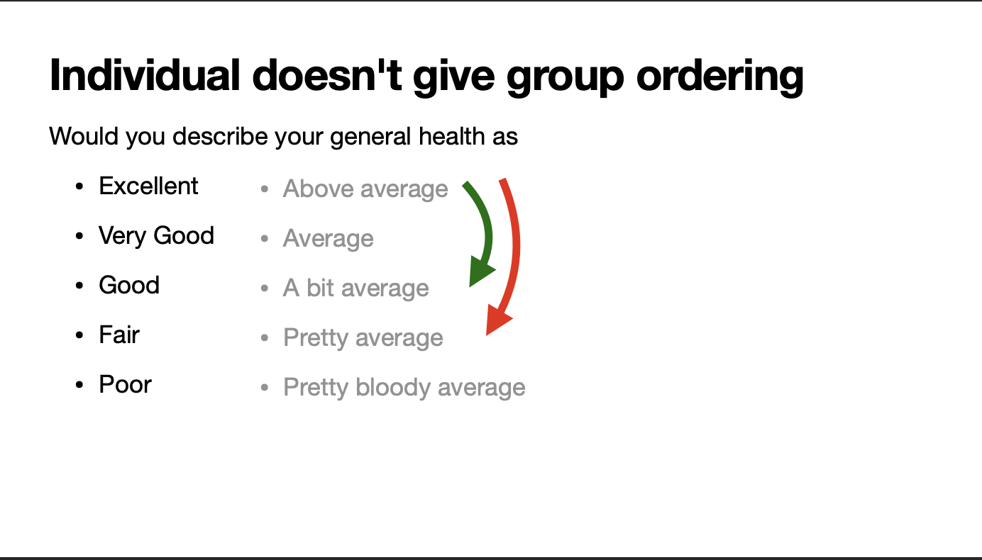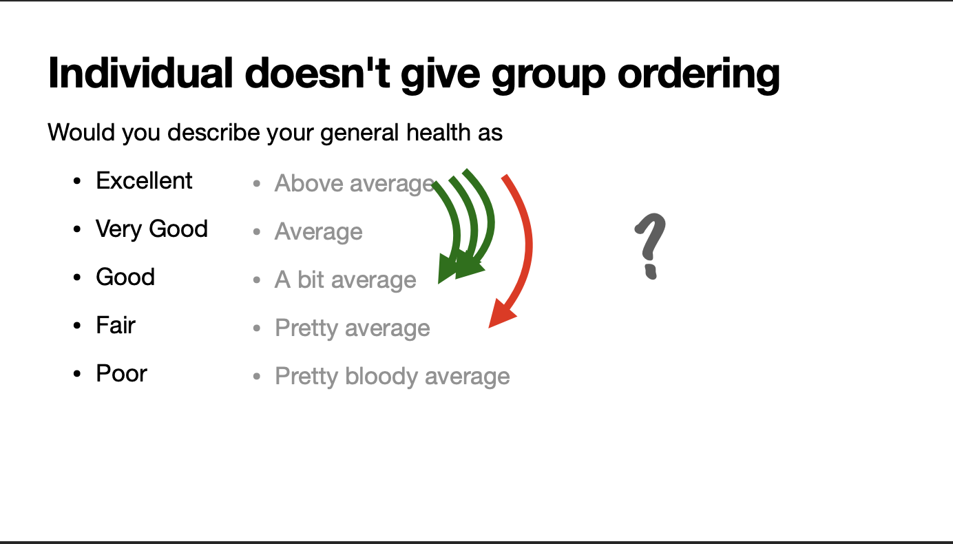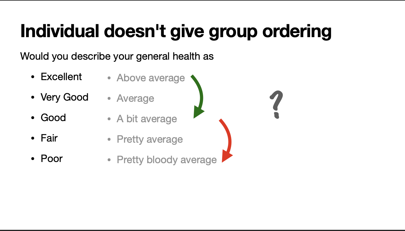 - Someone (?Cameron Patrick) asked about how this differs from Frank Harrell’s views and why. I think (having given a version of this talk at his department and talked to him about this) that Frank regards failures of ordering as less important and less plausible than I do. He has also been more interested in ordinal scales as a way of pushing back against dichotomisation in medical statistics.