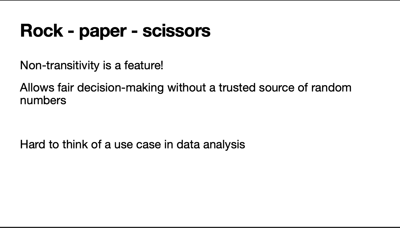 Obviously the rock-paper-scissors ordering can’t happen with the t-test, because that orders distributions by their means, which is a perfectly ordinary linear preorder on numbers. But can it happen with some tests?