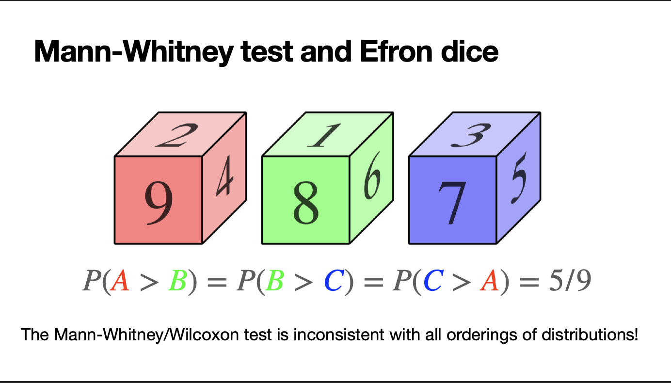 Timothy Gowers and the internet have a paper (a Polymath project) showing that this non-transitivity is in some sense the generic behaviour. That is, if you generate -sided dice by sampling their faces from , the Wilcoxon/Mann-Whitney test will agree with the ordering by means if the means are different, but if the means are the same then