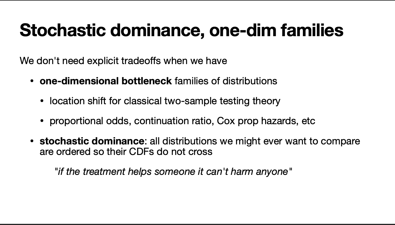 For some trials, people have put more effort into thinking about whether a treatment is likely to affect all levels of the outcome in the same way. They might also have looked at past datasets to see if comparisons between interesting subgroups of the data typically do satisfy stochastic dominance.